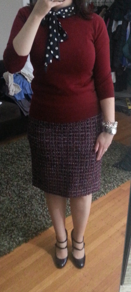 Hello blog world! I know I’ve been seriously neglecting this space of the interwebs and right now I’m blaming my busy season at work and the ease of Instagram for posting my daily outfits. But I’m not giving up – there are just so many hours in a day. I have to say I did a solid job of outfit planning this week- I actually planned my entire week of outfits on Sunday night. But regardless, there are always tweaks, and sometimes what I think looks good in my head needs a few changes before it’s perfect…I think of it as the evolution of an outfit – add a jacket, key accessory, switch up the shoes, and you’re good to go. I have time for tweaking in the morning before work – I do not always have time for full out planning. Earlier this week I was planning on (finally) wearing my J.Crew maple tweed pencil skirt – the photos in these pics don’t really do this skirt justice – it is gorgeous. There are so many possibilities with this skirt. I immediately went to navy with it but after searching through my closet really liked how the burgundy made it pop – so why not do both? And I might as well toss a pattern in there – the polka dots worked really well with the tweed. Here’s the website photo of this lovely skirt.