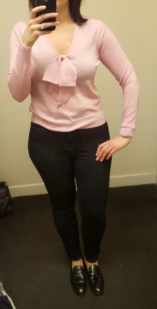 The merino on this sweater is very lightweight and while the photo doesn’t look so bad, it felt incredibly short on me. It is a pretty shade of peppermint pink. The V-neck was lower than I would have liked. I think I might have liked this better in navy – the bow felt floppy to me and overall it was a miss.
