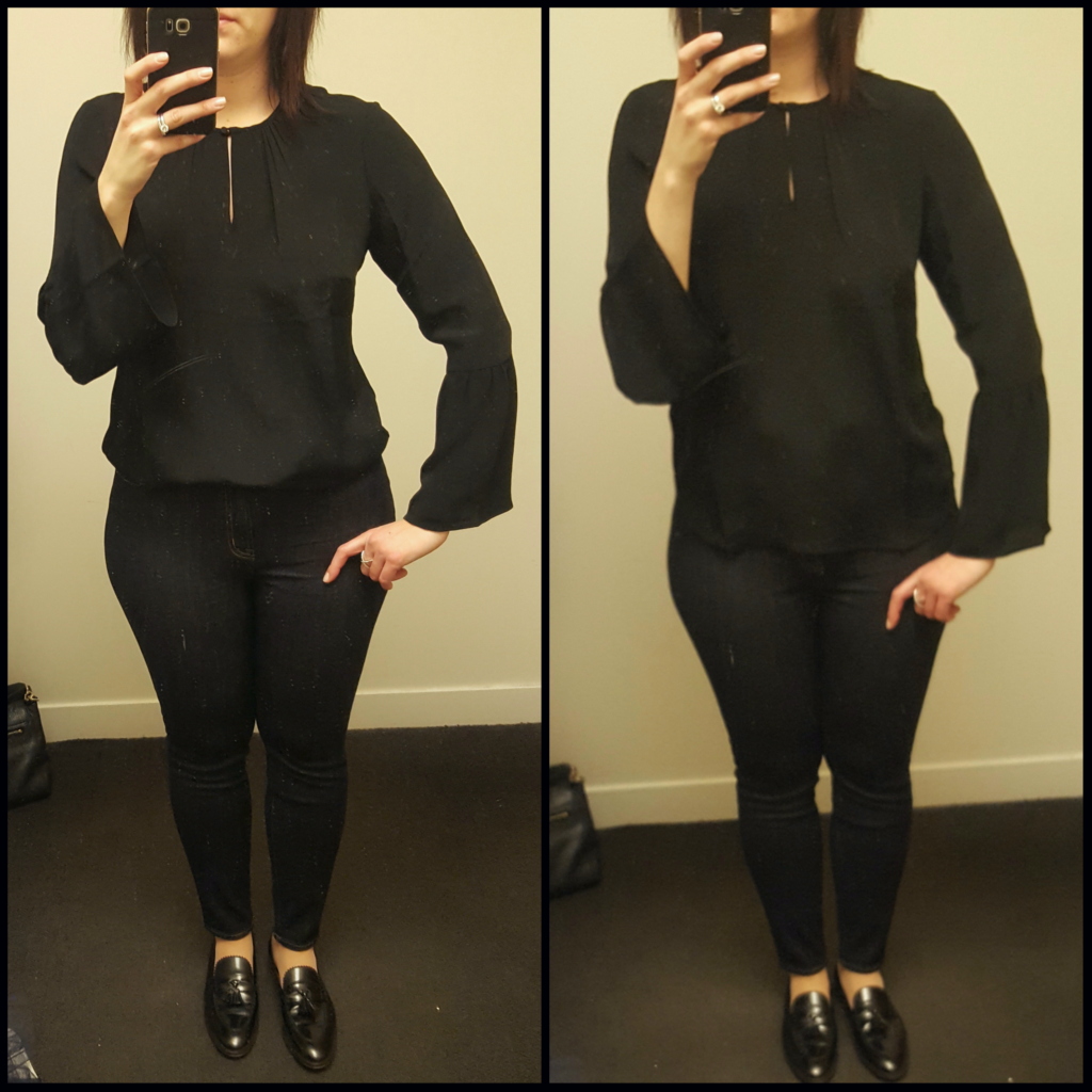 Ok, again, as I’m looking at these photos, I don’t hate it. I did want it to be longer though. I’m wearing high waisted jeans so the shortness isn’t completely apparent. This blouse doesn’t come in a tall length but it does come in petite. I’m wearing a 10 in these photos. I like that it’s silk. It comes in a brighter blue, navy and ivory as well.